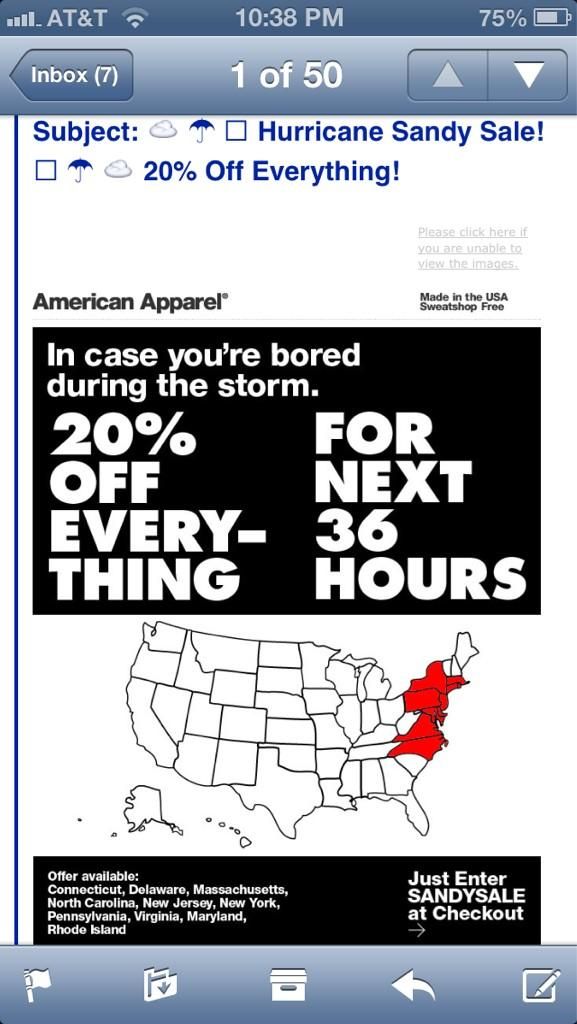 : American Apparel showing how not to do it with a Hurricane Sandy sale. 'In case you're bored'.