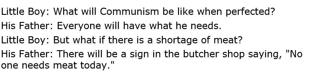 : I thought I knew all Communist jokes. But I did not know this one my son sent me yesterday.