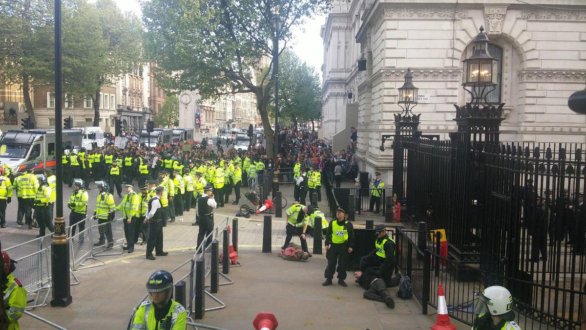 : People being detained by police in #London. Can see 5 people in the ground outside Downing Street