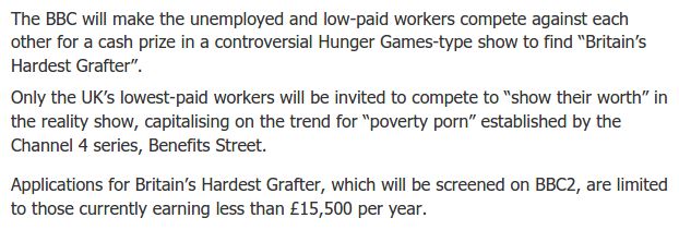 RT @alanferrier: Not a spoof. The BBC really intend to broadcast this. Bread and circuses, eh? independent.co.uk/arts-entertainment/tv/news/bbc-to-pit-lowpaid-against-each-other-in-hunger-gamesstyle-show-to-find-britains-hardest-grafter-10279386.html