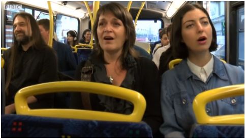 : "Guerrilla" Singers on #London bus exactly narrate the ride. #straphanger fun.